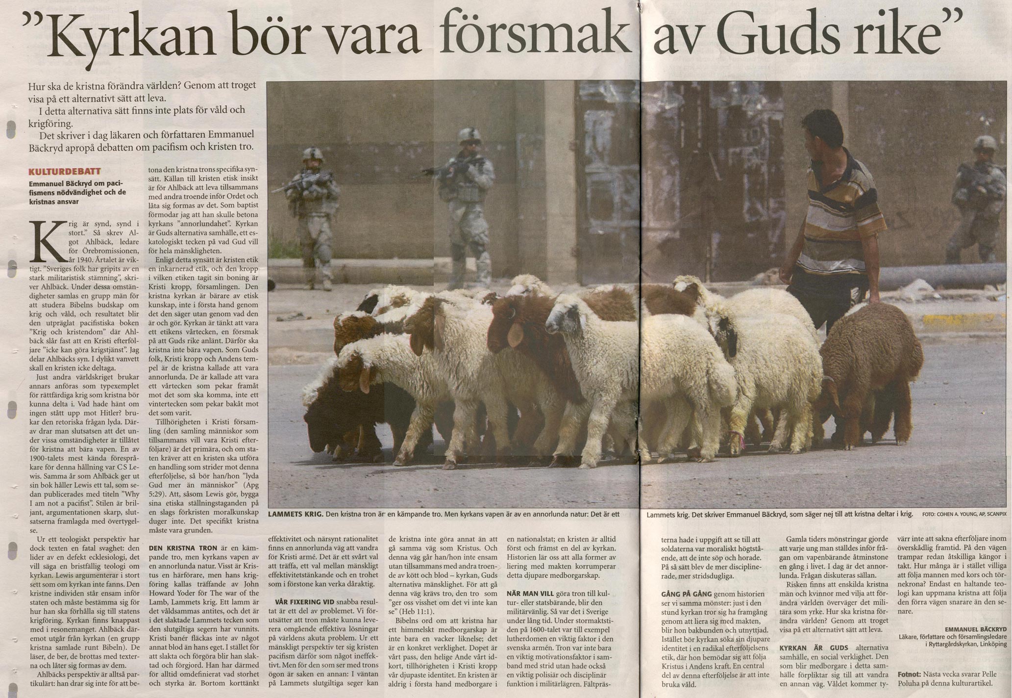 Förra veckan skrev läkaren, församlingsledaren och författaren Emmanuel Bäckryd en artikel i Dagen om pacifismens nödvändighet och de kristnas ansvar. Idag svarar jag honom i Dagen. Ingen av artiklarna går att läsa på Dagens webbplats och de återfinns därför nedan.