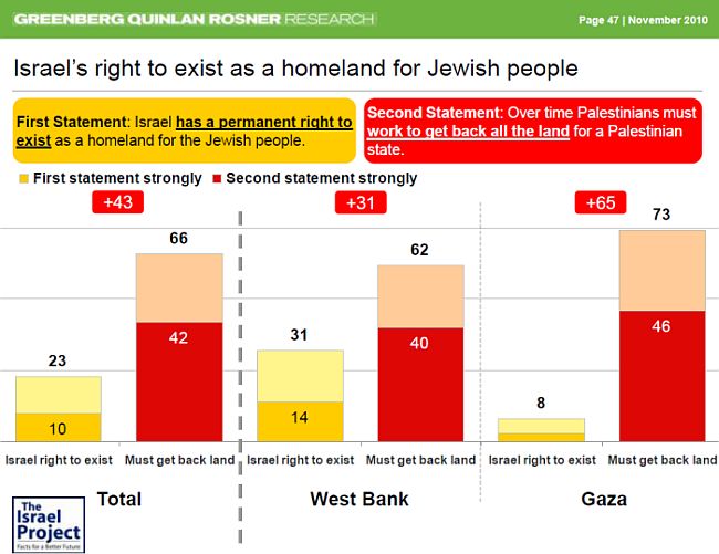 En nyligen gjord opinionsundersökning i Västbanken och Gaza visar att endast 23 procent av palestinierna menar att Israel har en permanent rätt att existera: