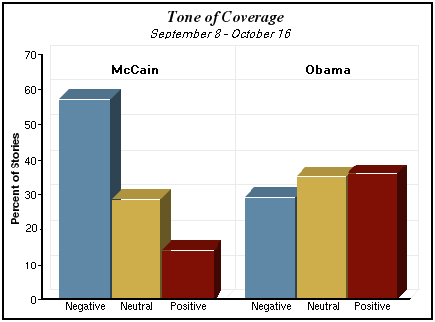 Via Dick Erixon ser jag att Pew Research Center studerat amerikansk medias bevakning av de båda presidentkandidaterna. Resultatet visar på en stor skillnad mellan bevakningen av McCain och av Obama: för Obama överväger de positivt vinklade nyheterna medan skildringen av McCain är övervägande negativ.